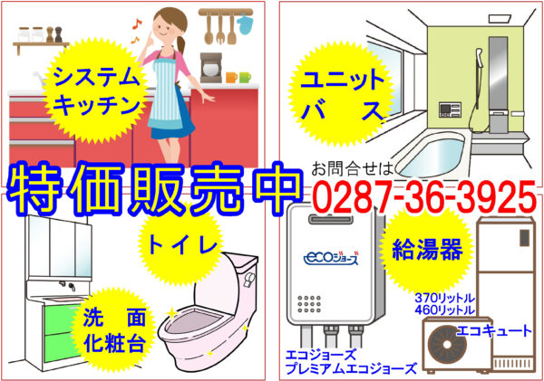 相互企画では、システムキッチン、ユニットバス、洗面化粧台、トイレ、給湯器などの特価販売を随時実施しますので、関心のある方はお気軽にお声掛け下さい。
