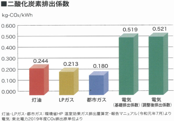 電気はエコであると勘違いされがちなのですが、灯油やガスと比較して、二酸化炭素排出係数が倍以上なのです。