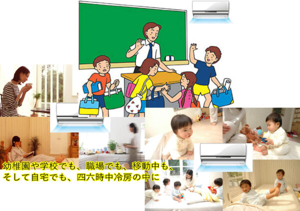 なぜなら、ホール、トイレ、洗面脱衣室、浴室、全ての屋内が冷房の中にあるということは、より一層冷房漬けになることをもたらすこととなり、より一層汗をかけない、かきにくい子どもたちを増やしかねないからです。