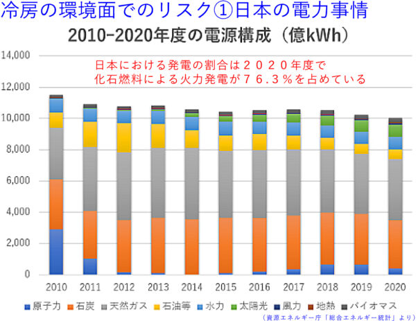 冷房の普及が進み、使用頻度が高まるということは、消費電力量が増えるということであり、結果として二酸化炭素の排出量が増えるということとなり、温暖化を助長するということになるのです。