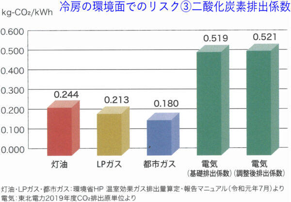 エネルギー効率を基に、灯油、LPガス、都市ガスと、電気の二酸化炭素排出係数を比較してみますと、電気のほうが約2.1倍から約2.9倍大きくなっています。