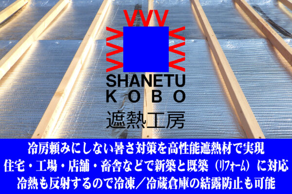 高性能遮熱材で、工場・店舗・倉庫・畜舎・住宅・様々な建物の冷房頼みにしない暑さ対策と大幅光熱費削減、冷凍/冷蔵倉庫・ダクトの結露解消と大幅光熱費削減などを実現しています。